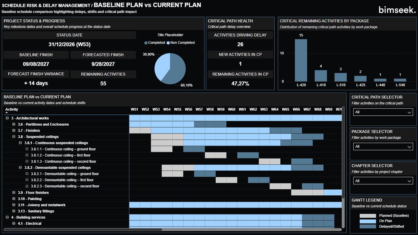 Interact with the dashboard to compare baseline and current plans and assess delay drivers and recovery potential.