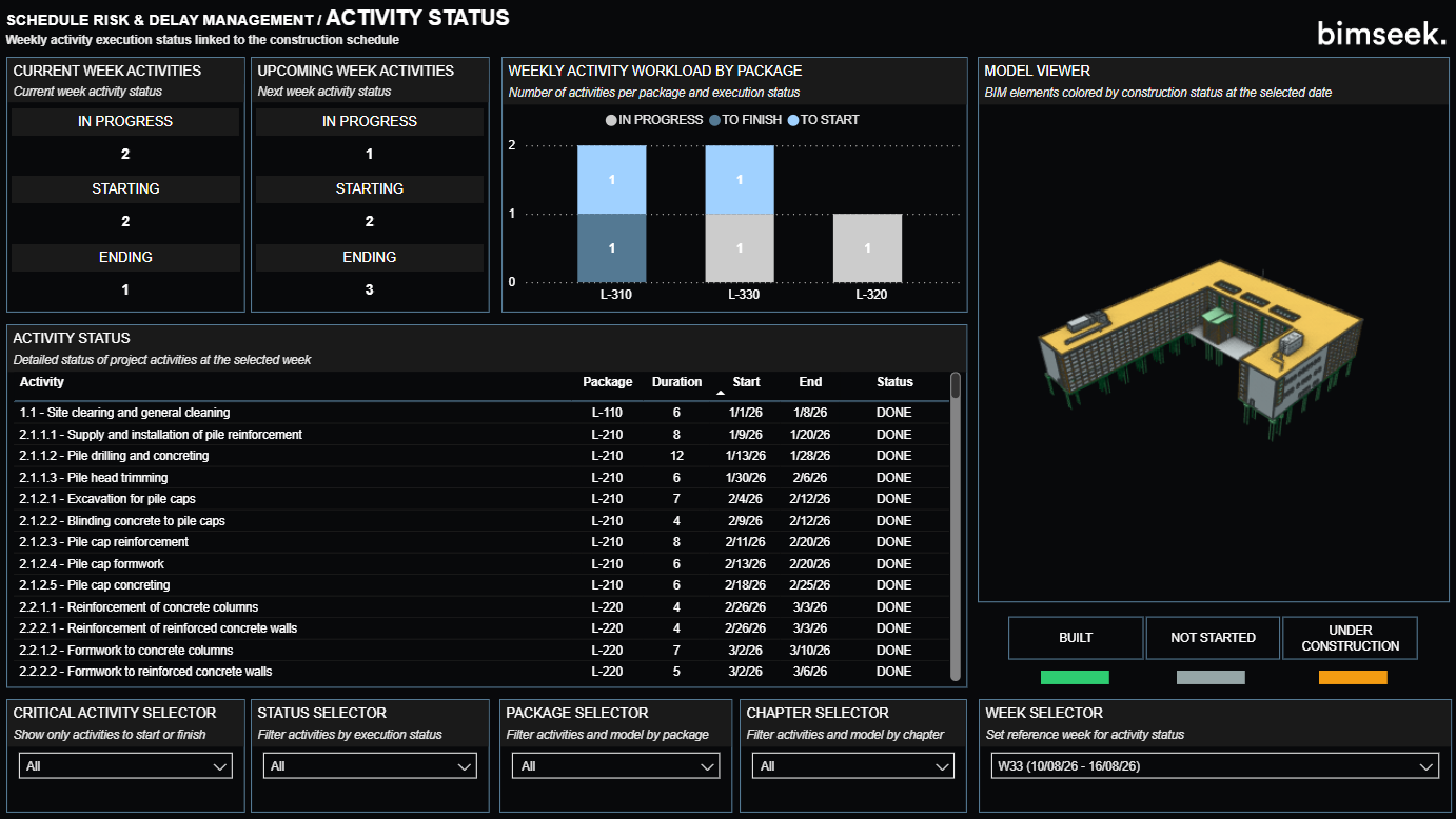 Short-term execution monitoring reveals activity status, upcoming work and near-term constraints.